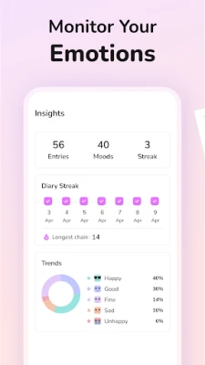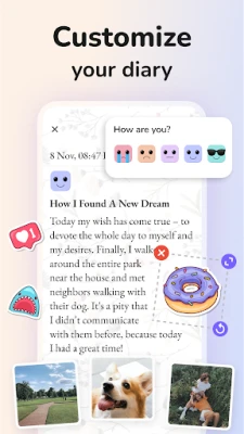 Bagātiniet savu dienasgrāmatu ne tikai ar vārdiem, bet arī ar attēliem, veidojot vizuālu atmiņu krātuvi. Izmantojiet integrēto garastāvokļa izsekotāju, lai sekotu līdzi savām emocijām un labāk izprastu, kas ietekmē jūsu labsajūtu, palīdzot atklāt to, kas patiesi sniedz prieku vai rada diskomfortu. Ar kalendāra funkciju jūs varat viegli saglabāt un pārlūkot svarīgus notikumus un plānus. Ikdienas atgādinājumi palīdzēs jums izveidot regulāru pierakstu veikšanas paradumu, nodrošinot, ka nekas svarīgs netiek aizmirsts.