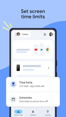 Mūsdienu dinamiskajā digitālajā pasaulē vecākiem nereti ir sarežģīti līdzsvarot bērnu piekļuvi tehnoloģijām ar veselīgu attīstību. Family Link piedāvā gudru risinājumu, lai izveidotu saskaņotus digitālās lietošanas noteikumus, kas atbalsta visu ģimeni. Ar Family Link Jūs iegūstat iespēju elastīgi pārvaldīt ierīces lietošanas laiku — iestatiet ikdienas limitus, izveidojiet īpašus grafikus mācību stundām un atpūtas brīžiem, nodrošinot, ka bērniem ir pietiekami daudz laika gan ekrānam, gan citām aktivitātēm. Tas palīdz veidot apzinātus paradumus un veicina līdzsvaru bērna digitālajā dzīvē.